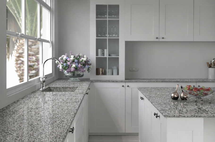 Die Arbeitsplatte dieser Küche ist aus dem Dekor Bayrischer Granit Blau/Grau gefertigt.