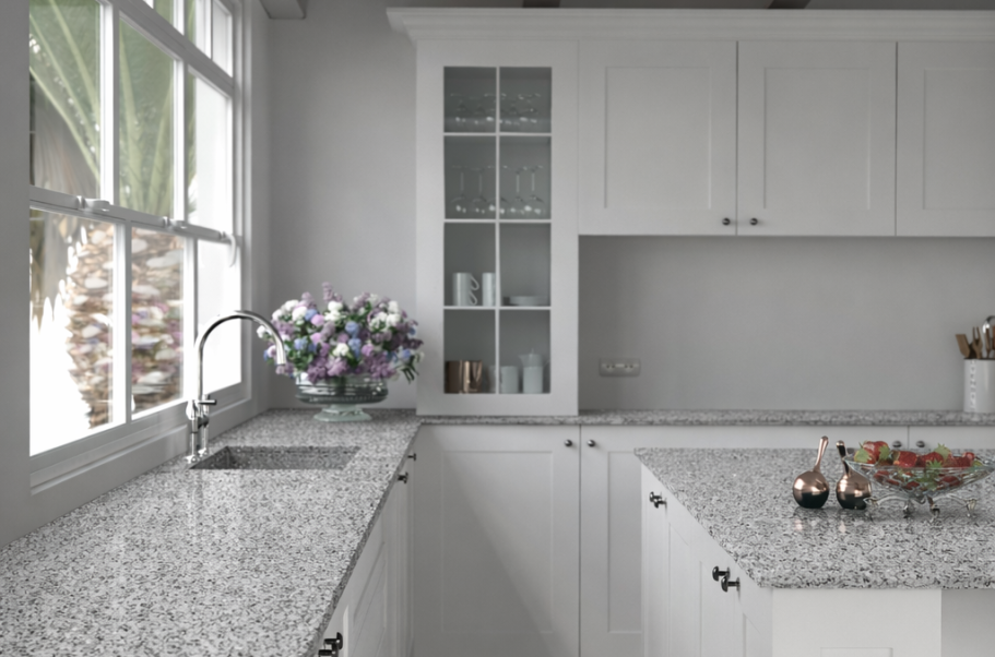 Die Arbeitsplatte dieser Küche ist aus dem Dekor Bethel White gefertigt.