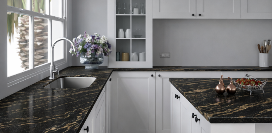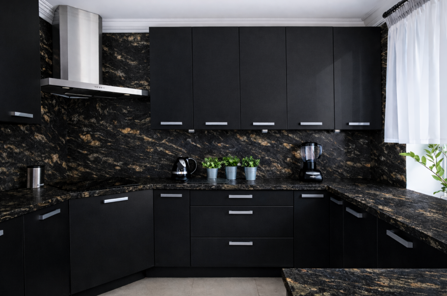 Die Arbeitsplatte dieser Küche ist aus dem Dekor Black Cosmic New gefertigt.