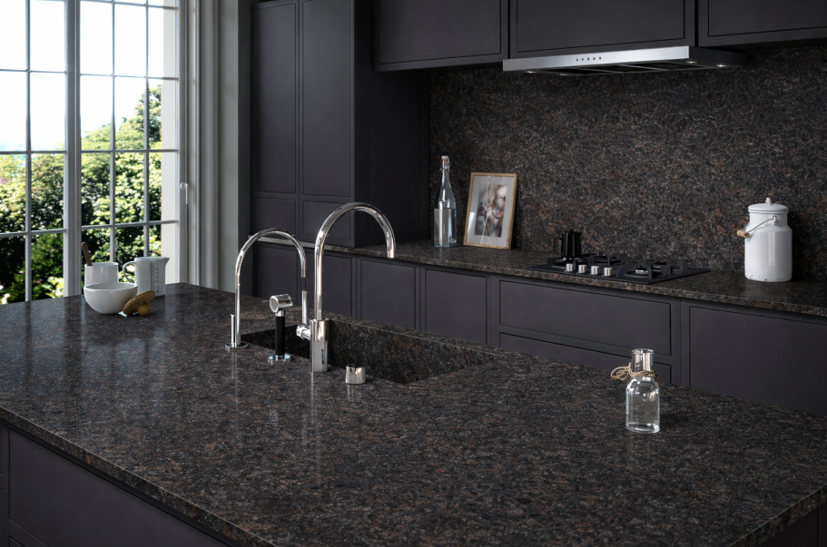 Die Arbeitsplatte dieser Küche ist aus dem Dekor Coffee Brown gefertigt.