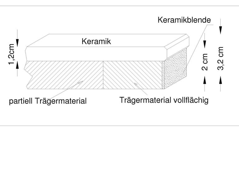 Bei Natursteinplatten bis 25 mm sowie Dektonplatten bis 19 mm werden großformatige Ausschnitte (z. B. Kochfeld- oder Spülenausschnitte ca. 750–1150 mm) ausschließlich mit konstruktiven Zusatzmaßnahmen ausgeführt.