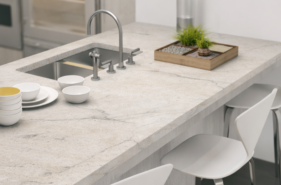 Die klar ausgearbeitete Kante unterstreicht den hochwertigen Gesamteindruck der Arbeitsplatte und verbindet Gestaltung und Funktion auf elegante Weise.