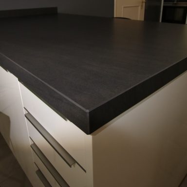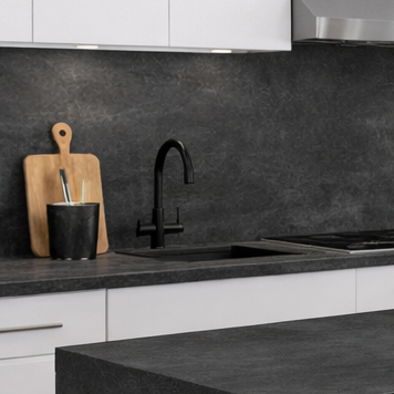 Die Arbeitsplatte dieser Küche ist aus dem Dekor Basaltblack gefertigt.
