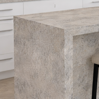Die Blockkante auf Gehrung verleiht der Arbeitsplatte eine markante, moderne Ausstrahlung mit klarer Linienführung und hochwertigem Abschluss. Dank der Gehrungsverbindung entsteht der Eindruck einer besonders kräftigen, massiven Arbeitsplatte – ideal für ein geradliniges Küchendesign. Der Bereich der Sichtkante entspricht dabei Farbe und Struktur der Arbeitsplatte und fügt sich harmonisch in das Gesamtbild ein. Die geschliffene Fase ist farblich auf das Arbeitsplattengrundmaterial abgestimmt und setzt einen dezenten, eleganten Akzent.