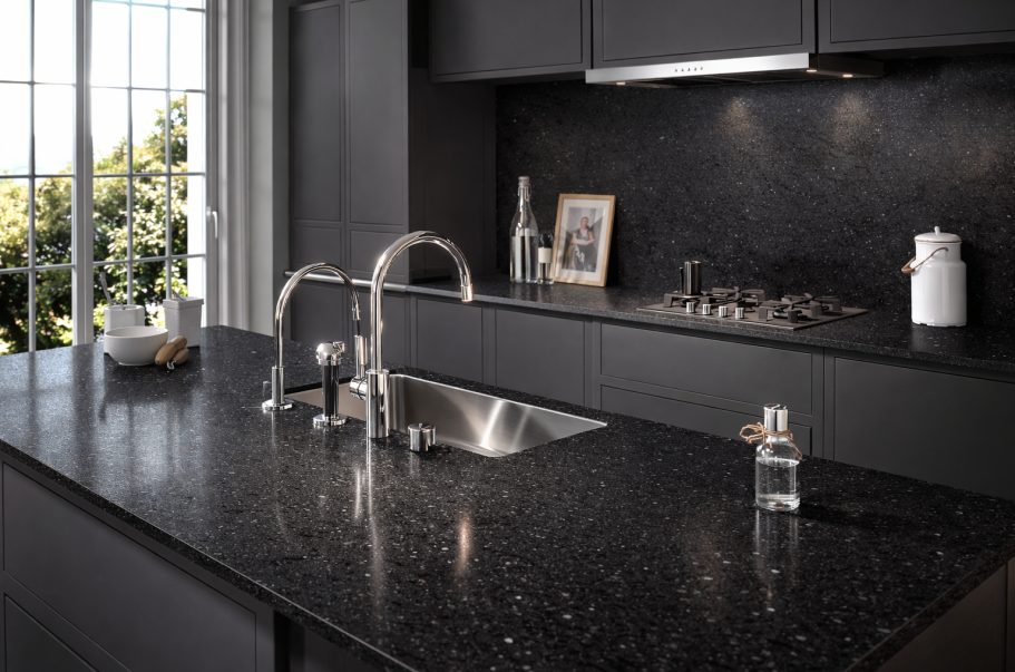 Die Arbeitsplatte dieser Küche ist aus dem Dekor Labrador Emmerald Pearl gefertigt.
