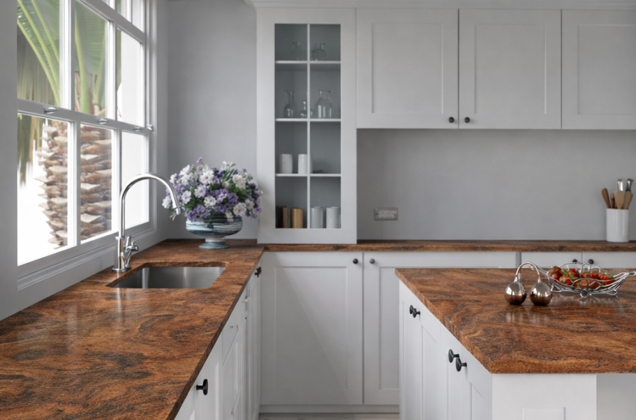Natursteinmuster, z.B. in den Ausstellungen, sind unverbindlich und zeigen nur den allgemeinen Charakter. Sie können niemals alle Unterschiede und Eigenschaften in Farbe, Struktur und Oberfläche in sich vereinen. Naturstein ist ein Naturmaterial, so dass in Farbe, Struktur und Oberfläche Abweichungen immer zu erwarten sind. Die Vielfalt der Natur bringt es mit sich, dass die fertige Arbeitsplatte immer anders aussieht als das kleine Muster oder die Musterabbildung einer Rohplatte. Naturstein zeichnet sich durch unterschiedlichste Aderungs- und Farbverläufe sowie Poren und Porenräume als auch Einschlüsse und Stiche aus.