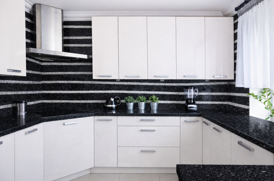 Die Arbeitsplatte dieser Küche ist aus dem Nero Assoluto Platinum gefertigt.