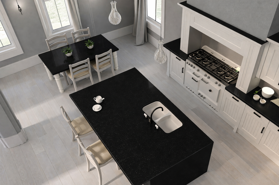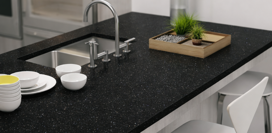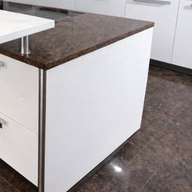 Die Arbeitsplatte dieser Küche ist aus dem Dekor Nero Star Galaxy Gold gefertigt.