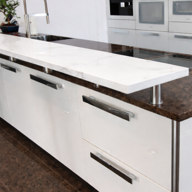Bei Arbeitsplatten in 20 mm Stärke sollte die Einbautiefe von Komponenten wie Spülen oder Kochfeldern frühzeitig mit eingeplant werden. Nicht alle Geräte sind für diese Stärken ausgelegt – gegebenenfalls ist eine Anpassung der Unterschränke erforderlich.