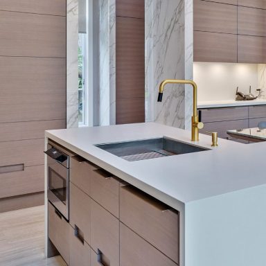 Die Blockkante auf Gehrung verleiht der Arbeitsplatte eine kraftvolle, moderne Präsenz und unterstreicht eine klare, geradlinige Gestaltung. Durch die präzise Gehrungsverbindung entsteht die Optik einer besonders starken, massiven Platte – ein Statement für hochwertiges, zeitloses Küchendesign.