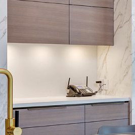 So entsteht eine ausgewogene Optik mit ruhiger Präsenz und angenehmer Haptik. Die weich ausgeformte Kante wirkt hochwertig und einladend zugleich und unterstreicht den zeitlosen Charakter der Arbeitsplatte.