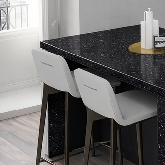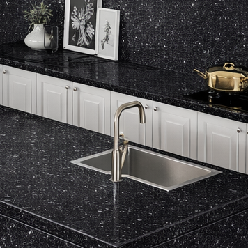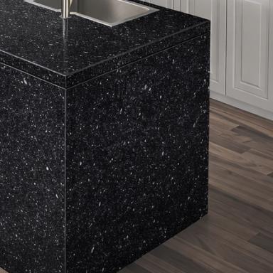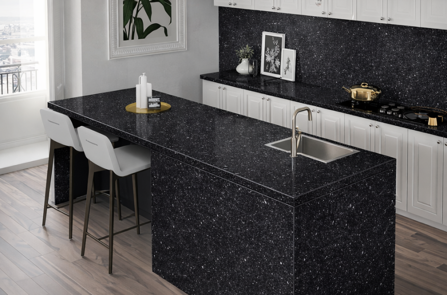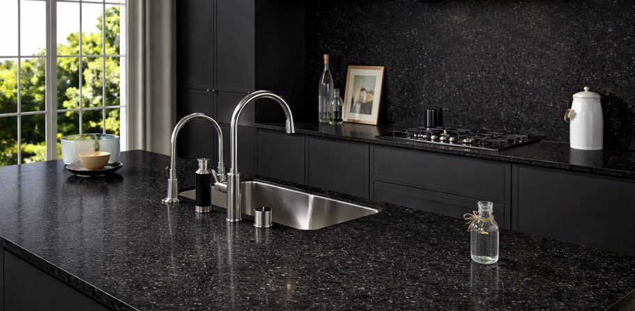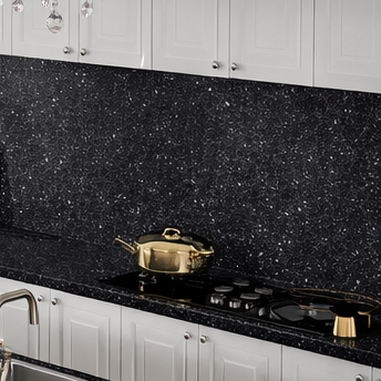 Die Arbeitsplatte dieser Küche ist aus dem Nero Star Stellaris gefertigt.