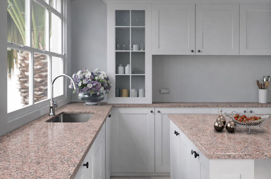 Die Arbeitsplatte dieser Küche ist aus dem Dekor Nero Rosa Porrinho gefertigt.