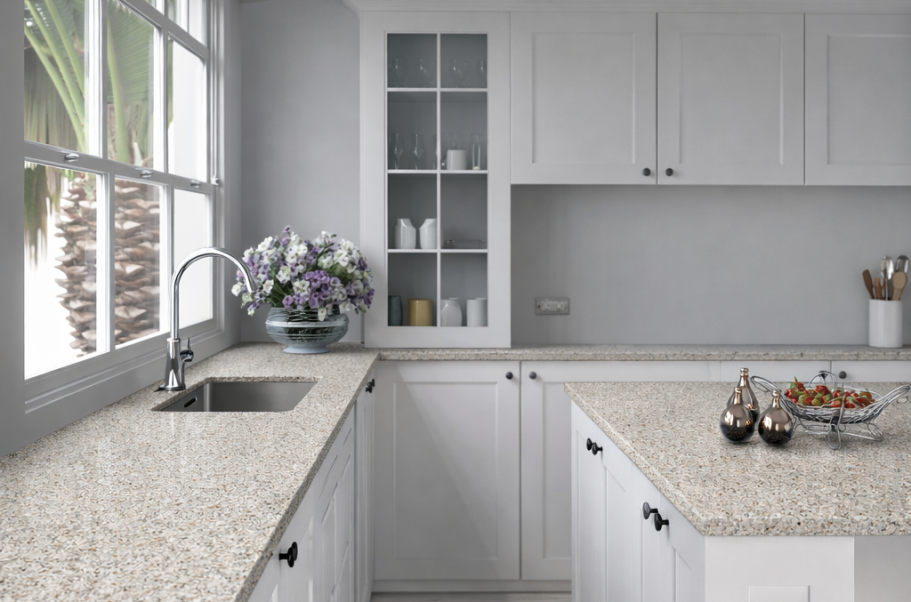 Die Arbeitsplatte dieser Küche ist aus dem Dekor Rosa Sardo gefertigt.